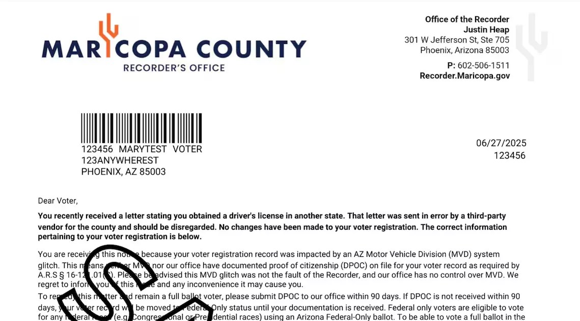 In Maricopa County, the second letter – which is dated June 27 at the top – explains how affected voters can resolve the problem.