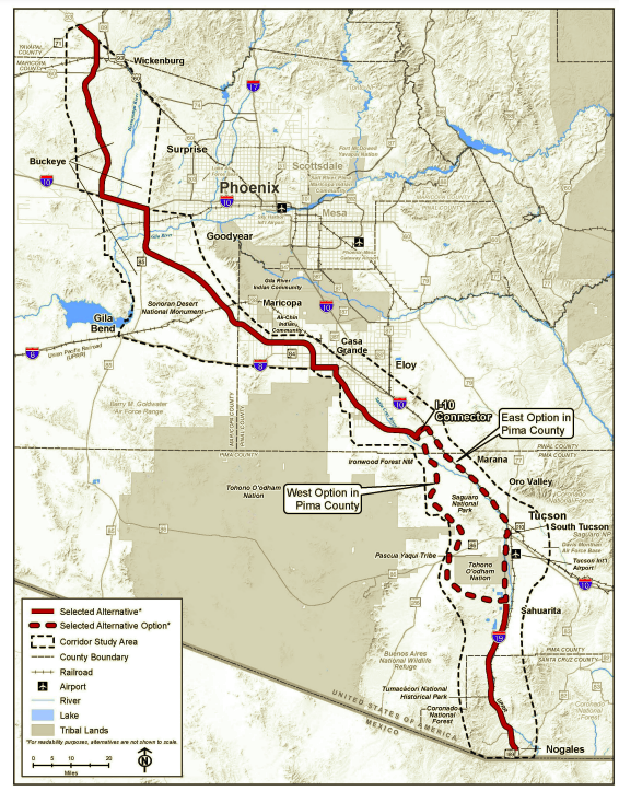 After about five years of study, the Federal Highway Administration approved plans for a new 280-mile long freeway expected to connect Nogales to Wickenburg in Arizona. This decision provides a key interstate link tying Phoenix and Las Vegas.