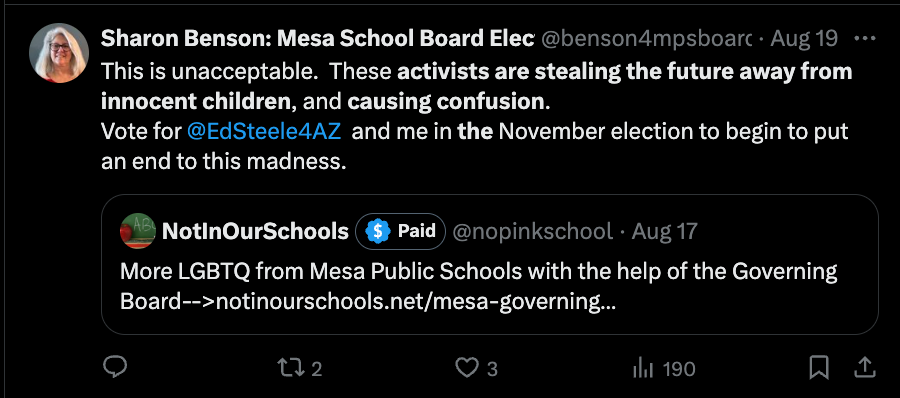 Now, Staas is suing people associated with those websites who are responsible for using misleading and false information in an alleged attempt to get her fired, including an incoming governing school board member for Mesa Public Schools, Sharon Benson, whose social media is littered with posts blaming LGBTQ+ people for poor academic outcomes across the country.