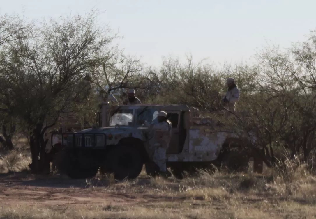 The unusual incident occurred at the San Miguel Gate, a border entry point only Native Americans can use. As New Times watched, two military-style vehicles rolled up near the small house standing about 200 yards south of the gate, in Mexico. Carrying assault rifles, several of the men in camouflage formed a cordon and appeared to be providing security. Others proceeded to load green bags or backpacks into the house. The house itself seemed unoccupied.