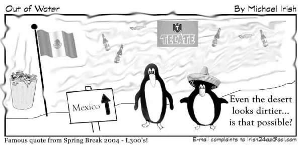 In one cartoon authored by Irish featuring a Mexican flag, a Tecate sign, a sign labeled “Mexico,” and a penguin wearing a sombrero, Irish wrote, “Even the desert looks dirtier…is that possible?”