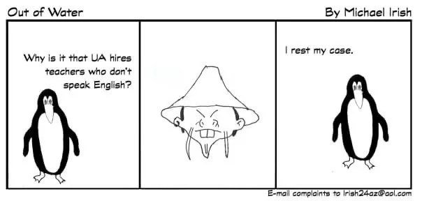 Another strip shows a penguin stating, “Why is it that UA hires teachers who don’t speak English” adjacent to a racist caricature of an Asian person. The next panel shows the penguin again with the text, “I rest my case.”