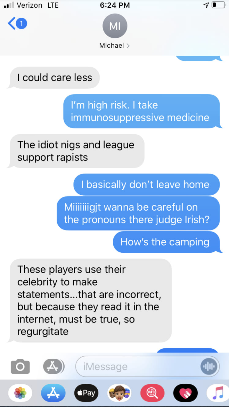 In other texts in the same thread, Irish said, “I’ve lost interest in the NBA with their BLM BS” and “Hockey is the only league that isn’t bitching, because they are all white and realize they make millions to play a game.” He also wrote, “Minorities want more because generations ago suffered so they need extra now.”