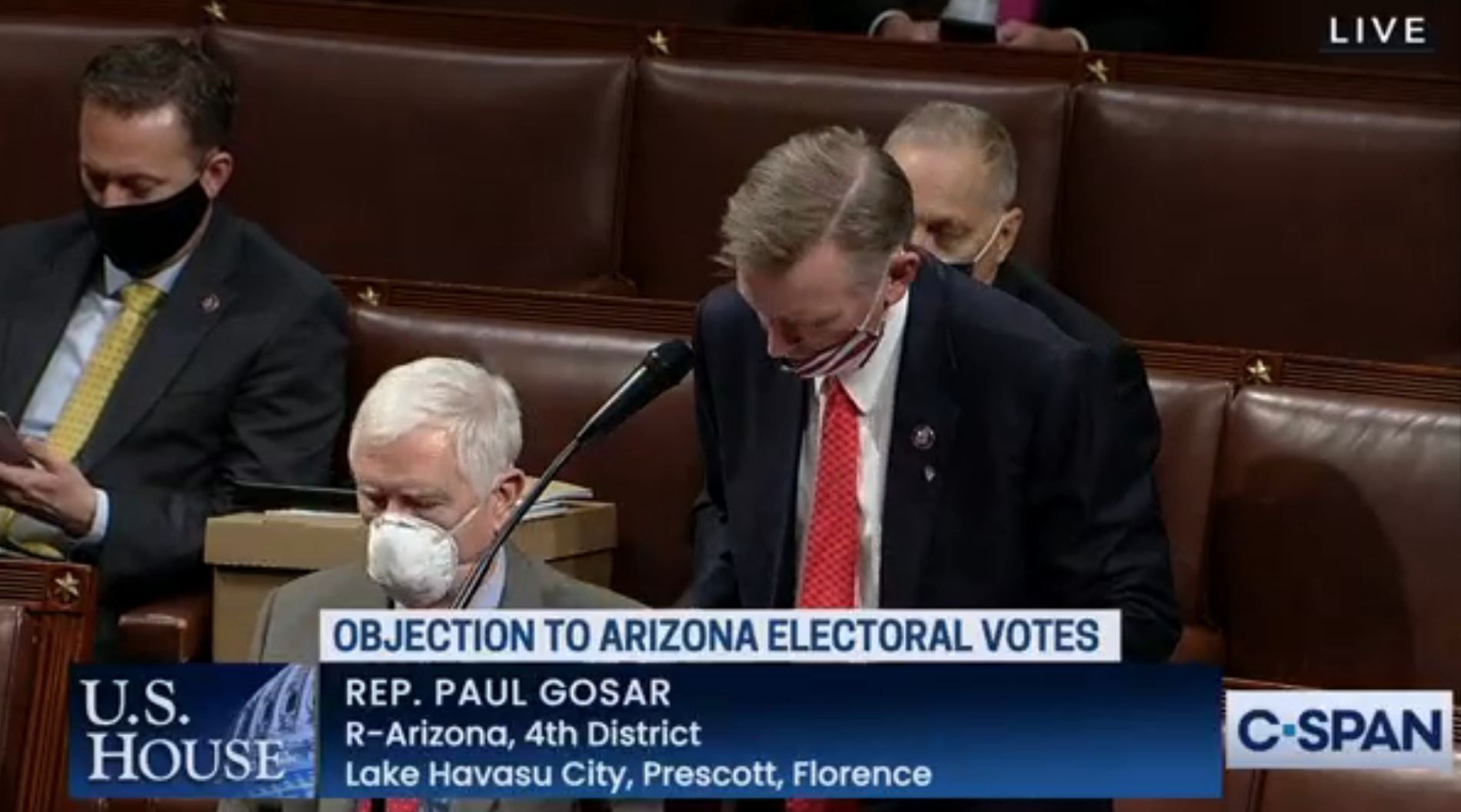 But most of the Republicans in Arizona’s congressional delegation still voted to reject their state’s electoral college votes, despite no evidence of election fraud or malfeasance in Arizona. Republican representatives Paul Gosar (4th District – Prescott), Andy Biggs (5th District – Mesa), and Debbie Lesko (8th District – Surprise) voted for the objection, while only Representative David Schweikert voted against it.
