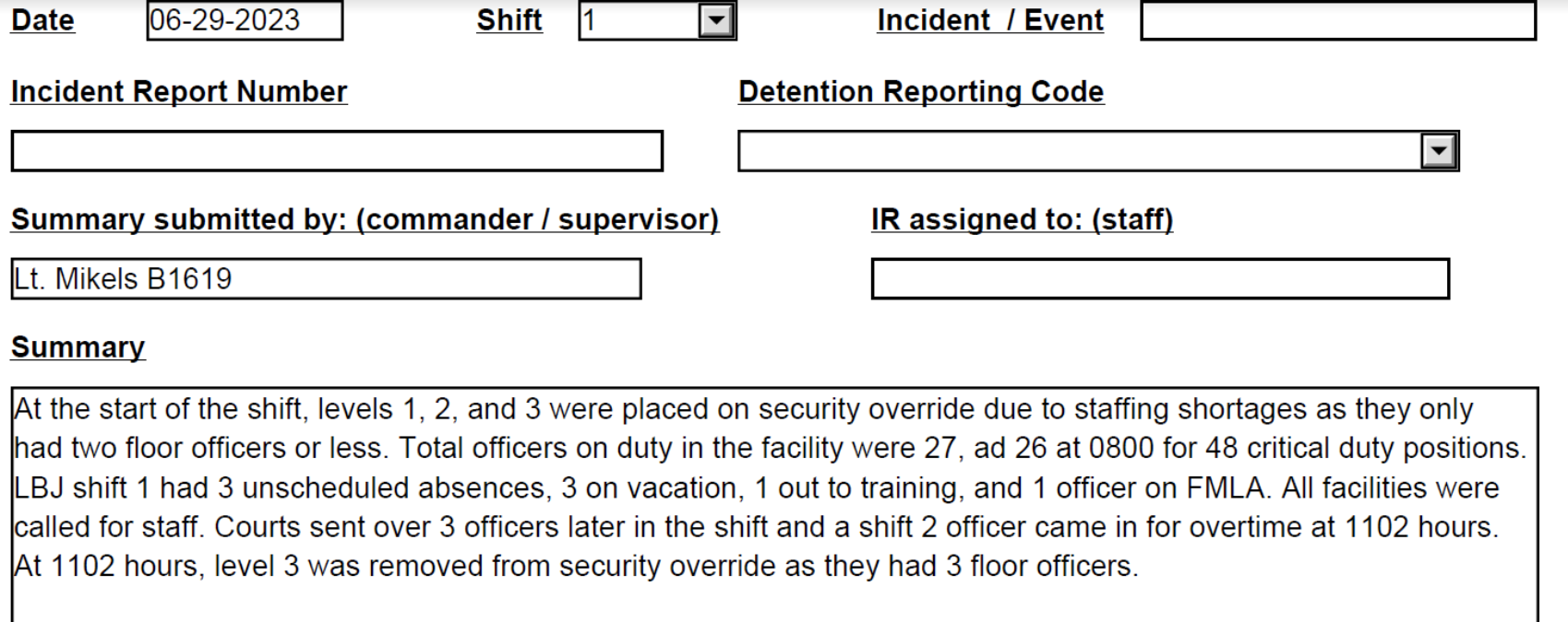 A recent shift summary obtained by New Times shows the impact of ongoing staff vacancies in the jails.