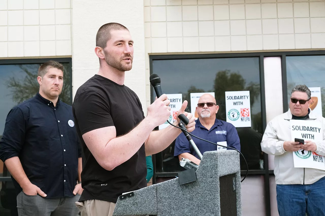 “We are all workers fighting for the same exact thing,” said JC Tretter, president of the NFL Players Association and a former player with the Cleveland Browns and Green Bay Packers. “We will stand behind you as players until you get what you deserve, and that is better wages, better benefits, and better working conditions.”