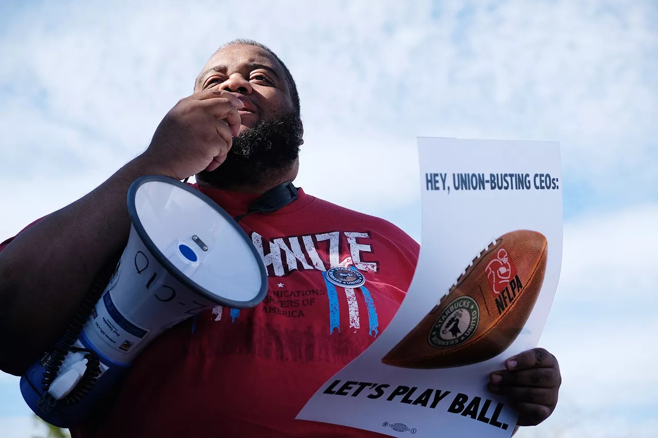 It was an unlikely gathering: NFL players stood beside Starbucks baristas chanting into bullhorns and holding signs that read, “Hey, union-busting CEOs. Let’s play ball.”