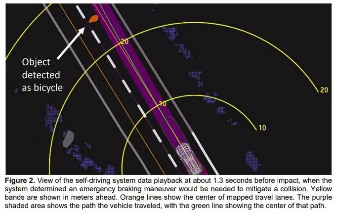 “At 1.3 seconds before impact, the self-driving system determined that an emergency braking maneuver was needed to mitigate a collision,” the report states. “According to Uber, emergency braking maneuvers are not enabled while the vehicle is under computer control, to reduce the potential for erratic vehicle behavior. The vehicle operator is relied on to intervene and take action. The system is not designed to alert the operator.”