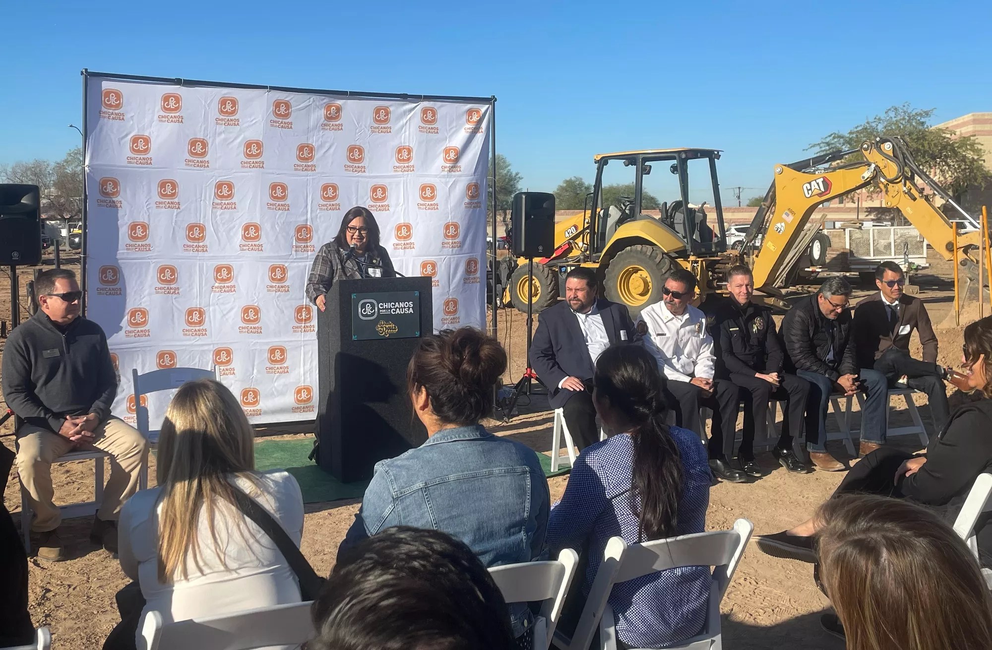 Chicanos Por La Causa President and CEO Alicia Nuñez talks to attendees at the organization’s affordable housing groundbreaking event.