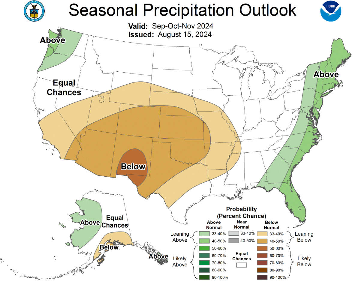 And while the U.S. Drought Monitor recently has brought good news for Arizona, the fall is expected to be dry. The entire state has a 40% to 50% chance of less-than-normal precipitation, according to the NWS. Only the East Coast, Washington and Oregon are expected to see above-average precipitation during the autumn months.