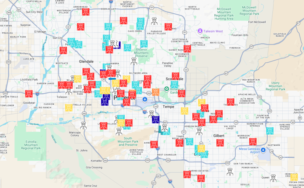 Borderlands and other groups keep their own internal map, but they declined to share it with New Times, citing privacy concerns. Thus, what follows is an incomplete snapshot of ICE activity in the Phoenix area. New Times initially posted this story in early August and updated the story again in January, as more ICE activity is expected to ramp up in the new year. Sightings are color-coded, with the earliest sightings in dark blue, progressing to light blue, white, yellow, orange and then bright red for the latest sightings. View an interactive version of the map here.