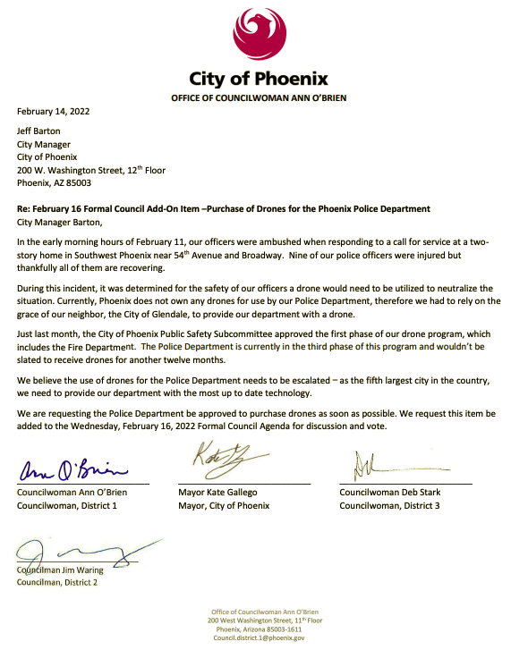 Ultimately, a memo requesting the city move the drone program forward was signed by Councilmembers Jim Waring, Deb Stark, and O’Brien, as well as Mayor Kate Gallego.