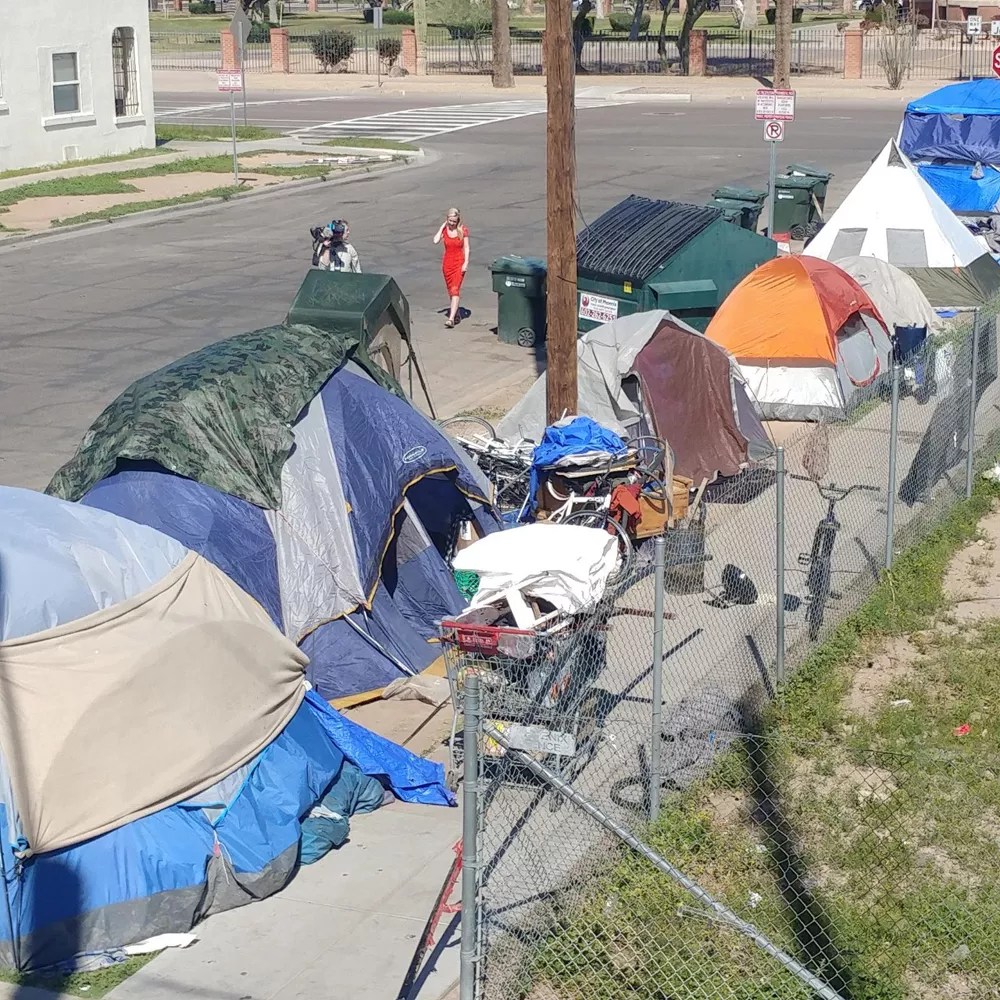 A news anchor walks past the tents of people living on the easements before the city displaced them.