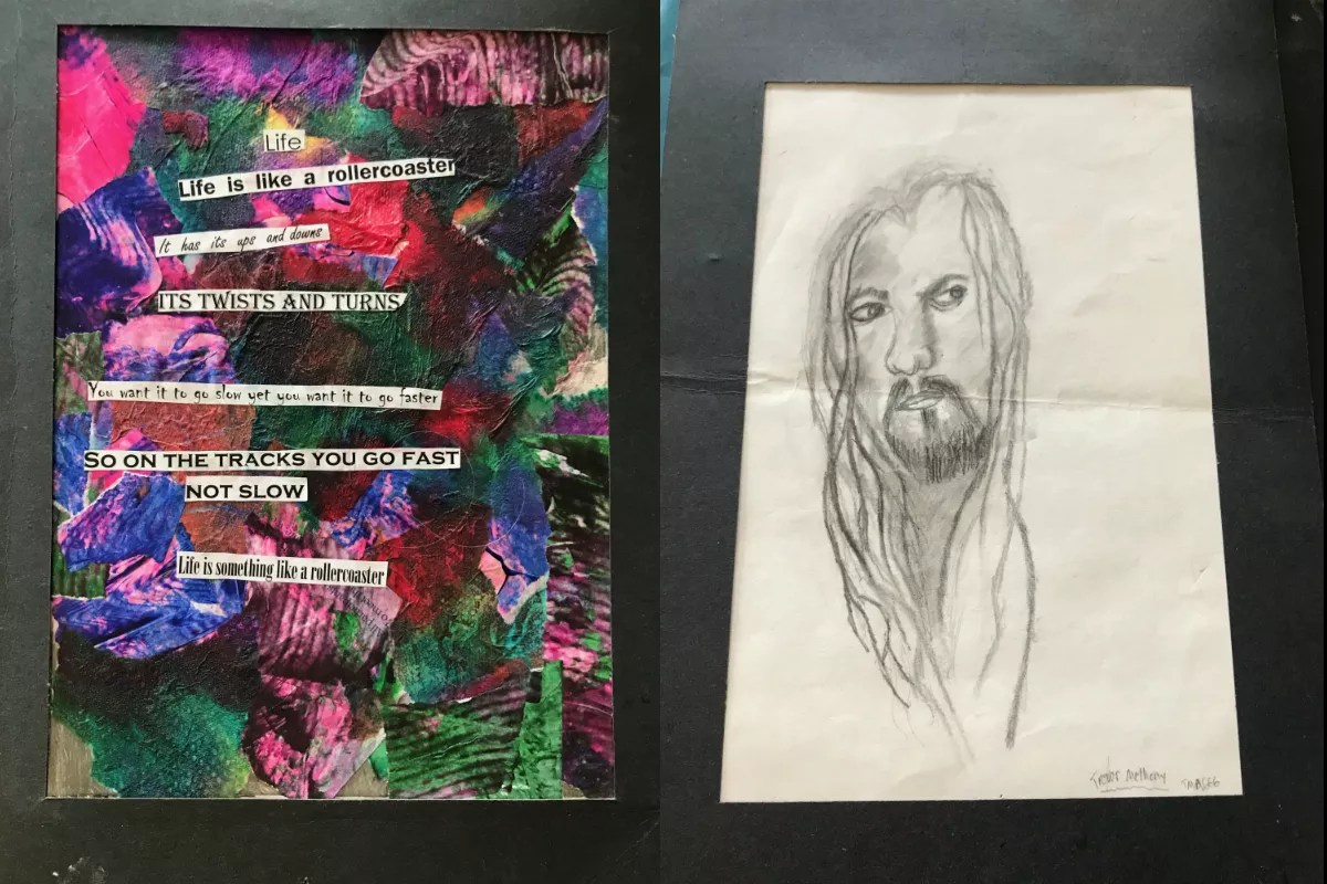 A collage and a drawing of Randy made by Trevor are among the bits and pieces of Trevor’s life that Lisa saved over the years.