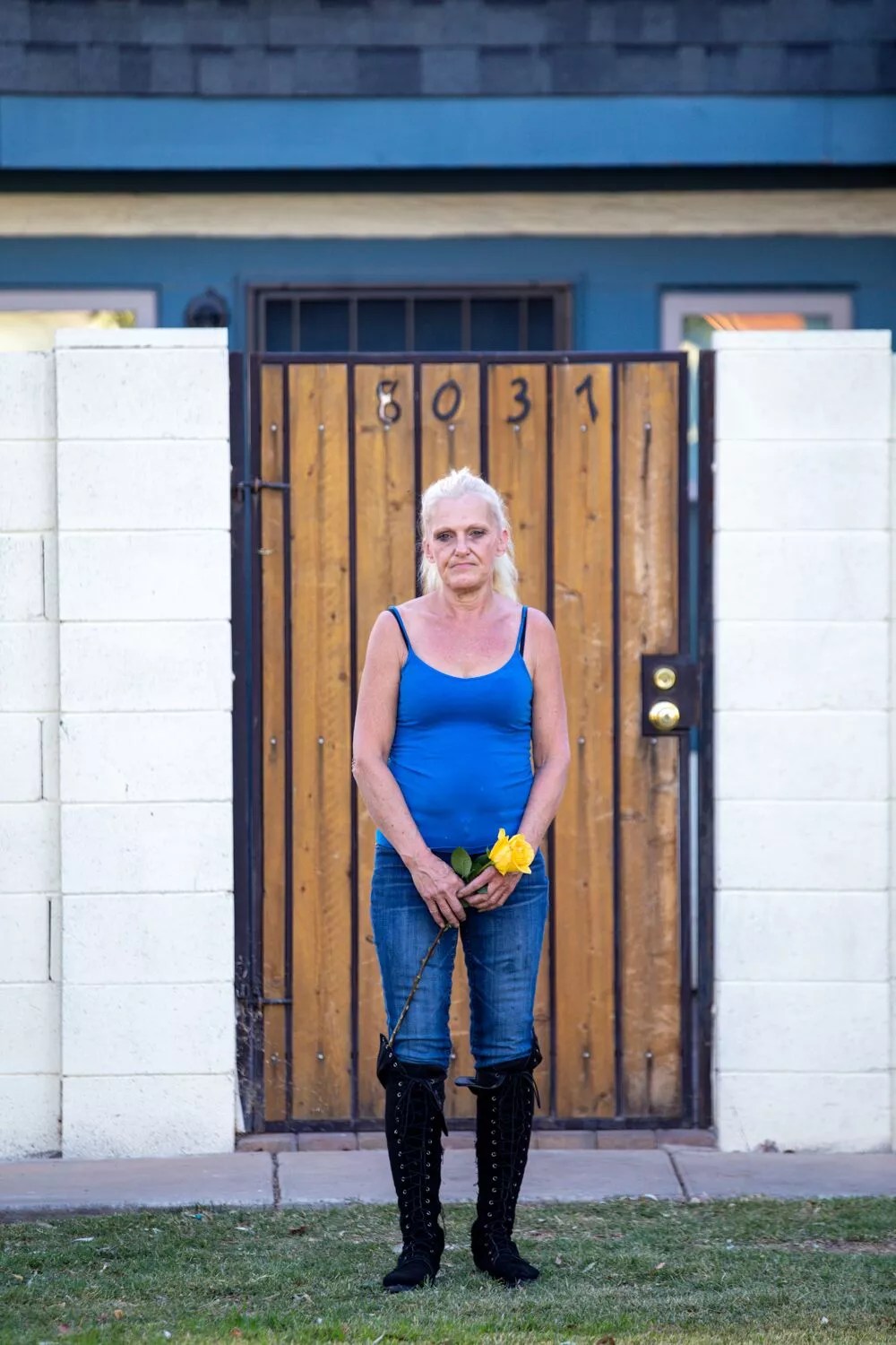 Lisa Lowery near the home where her son and husband were murdered.