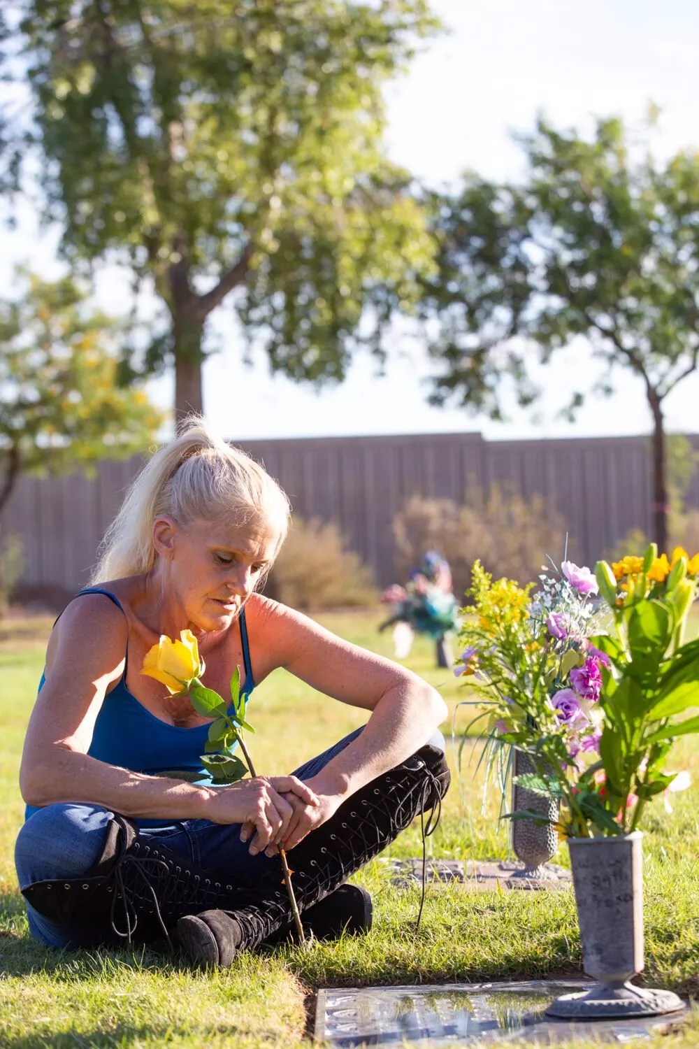 Lisa Lowery at the grave of her teenage son, Trevor.