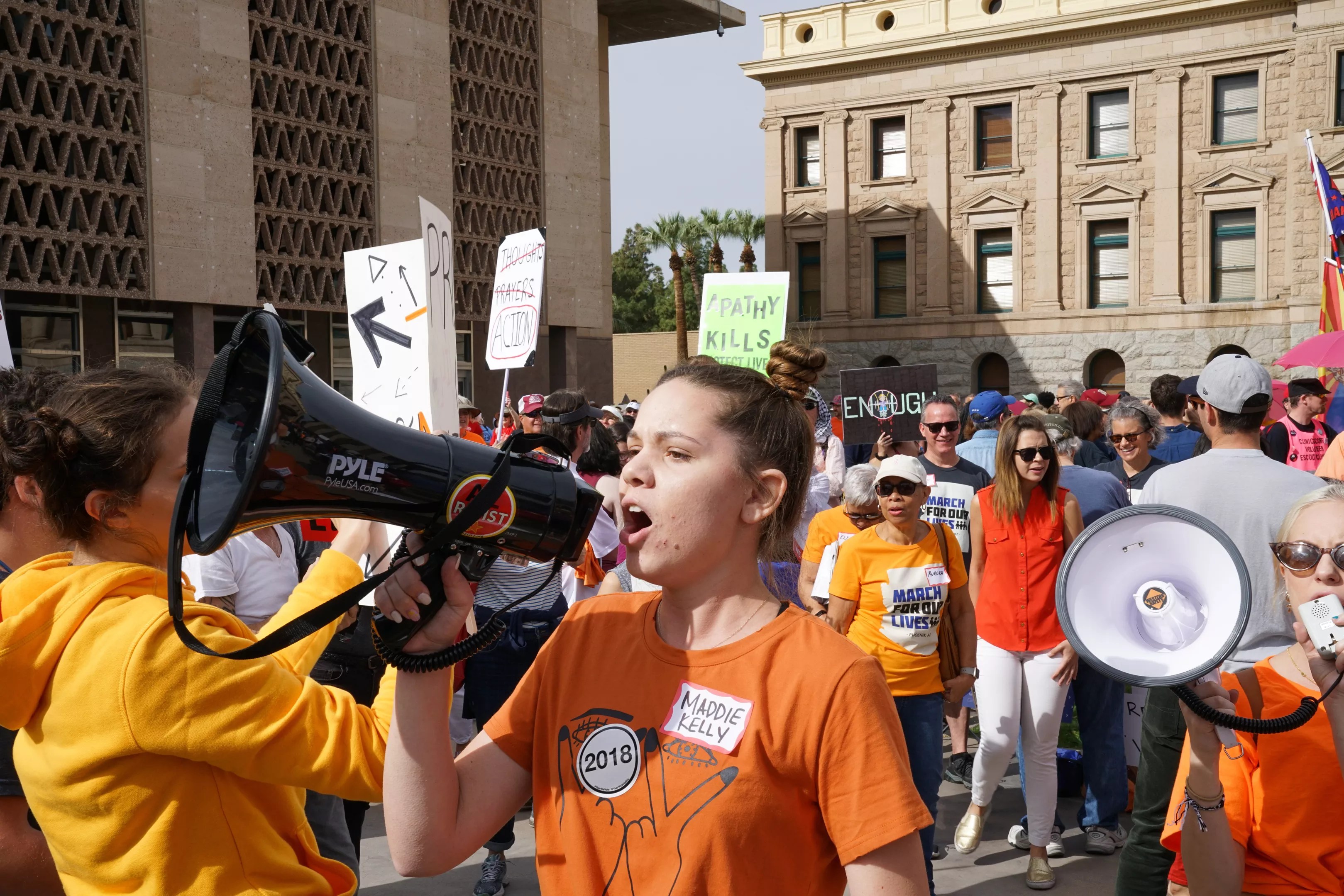 After the high schoolers, a series of speakers including Arizona Congressman Ruben Gallego and Arizonans for Gun Safety founder Geraldine Hills took turns at the microphone. The crowd then marched from the Capitol down Jefferson Street, which had been blocked off to traffic.