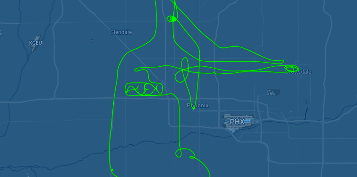 Then, about 45 minutes into the flight, the helicopter began circling just north of a stretch of Interstate 10 in west Phoenix near Maryvale. A map of the chopper’s flight path, captured on tracker websites like FlightAware, revealed what was going on. The chopper was spelling the name “ALEX” in the sky.