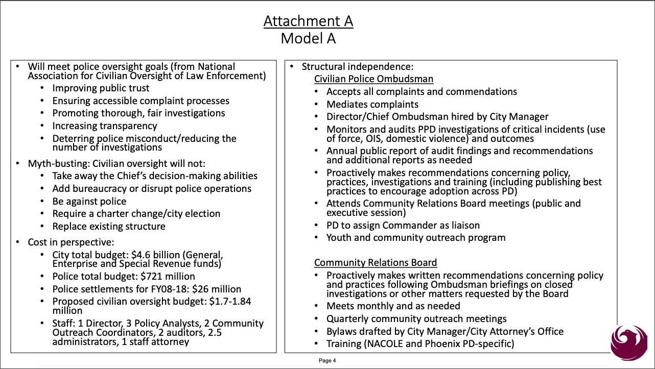 The city of Phoenix will take one step closer today to creating a new city agency to oversee the Phoenix Police Department. At 2:30 p.m., the City Council will meet to discuss – and possibly vote on – which model of civilian oversight Phoenix will adopt.