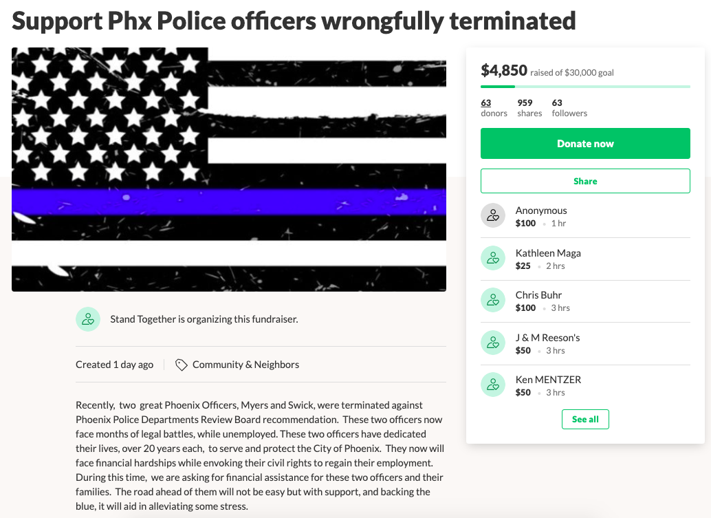 A fundraising page for the fired officers, which spells Christopher Meyer’s name wrong.