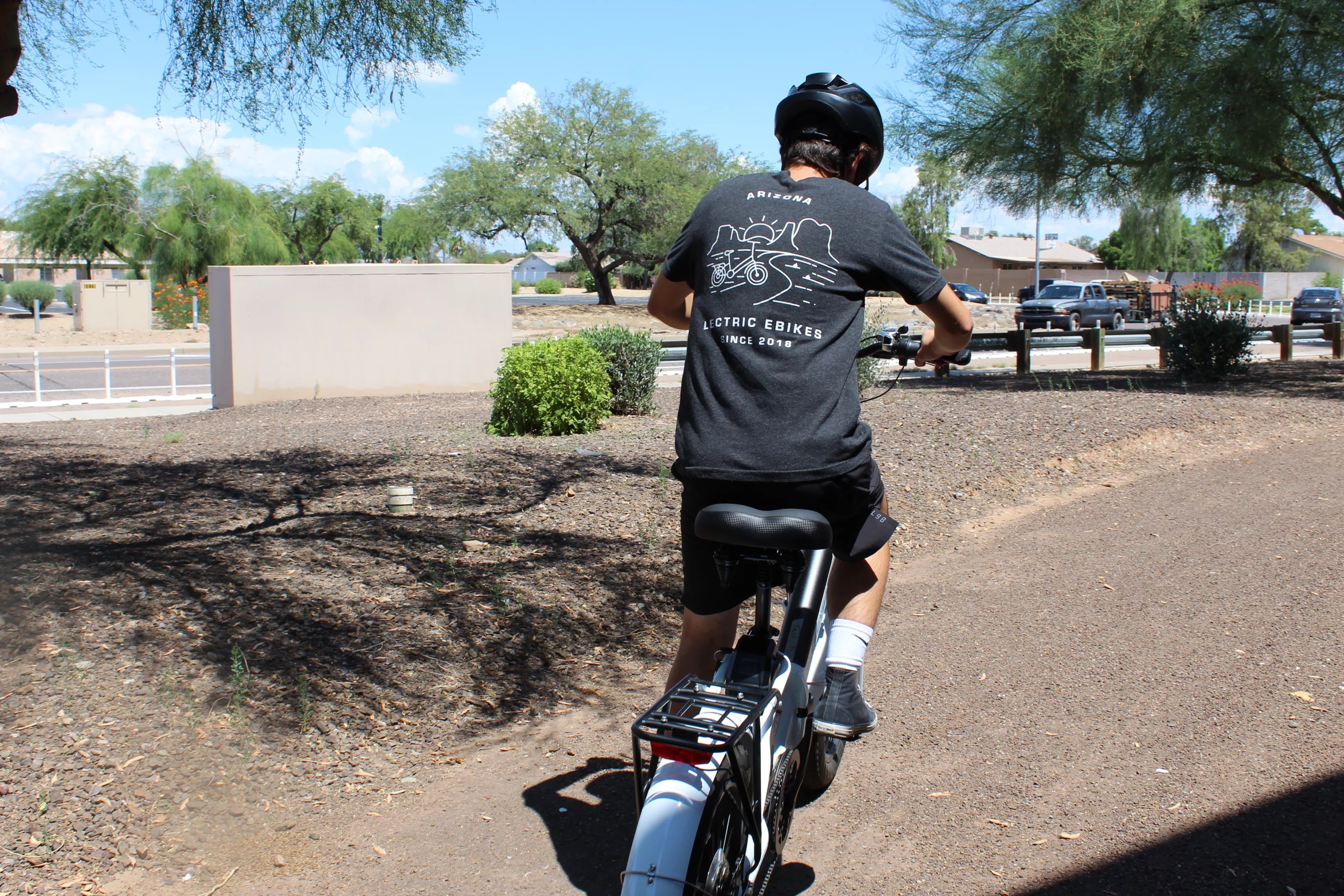 Alex Lo Duca, who supervises the Lectric eBikes showroom in north Phoenix, rides an XP 2.0 electric bicycle through Deer Valley Park.