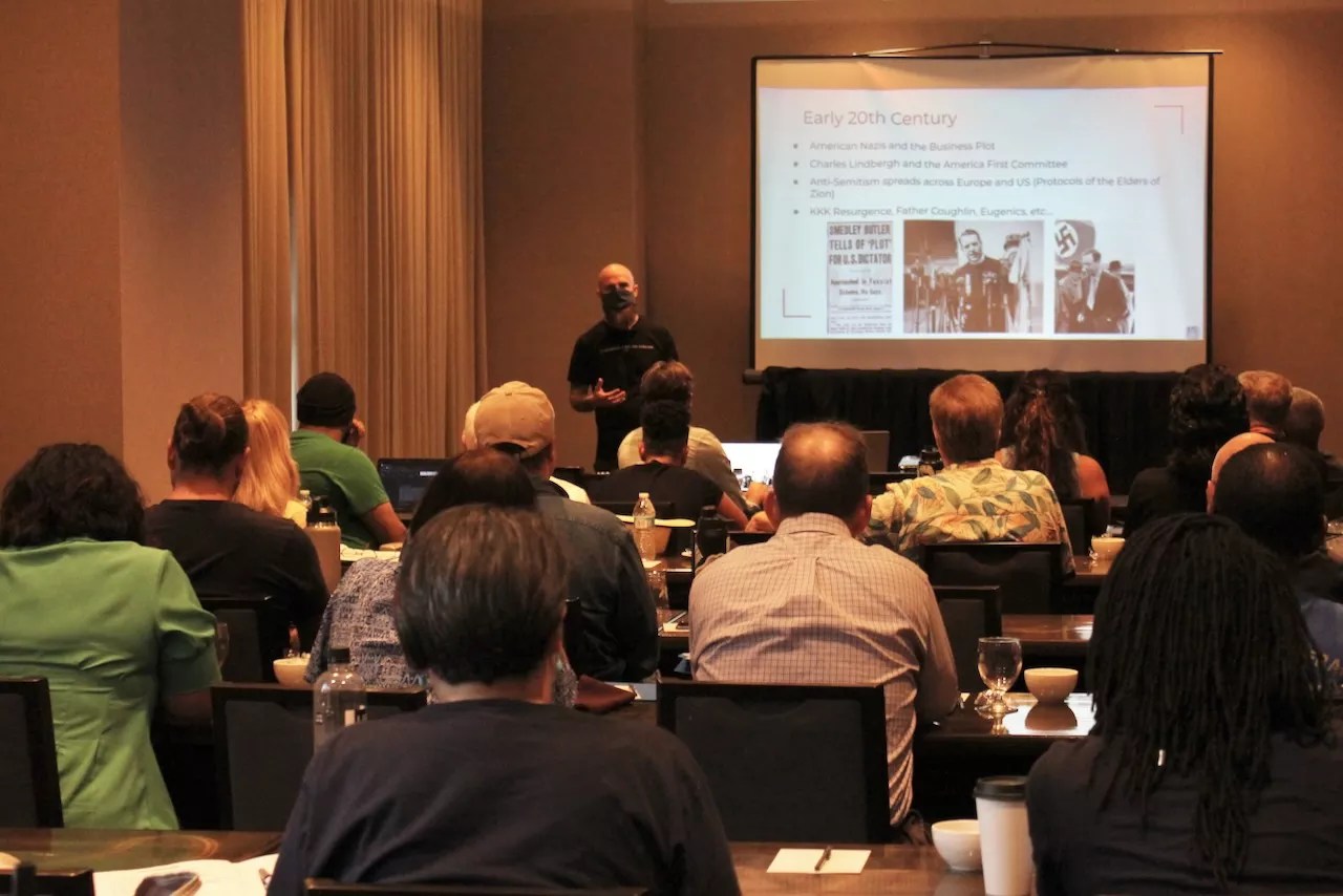 Task Force Butler founder Kris Goldsmith speaks to a room of veterans about the history of domestic extremism.