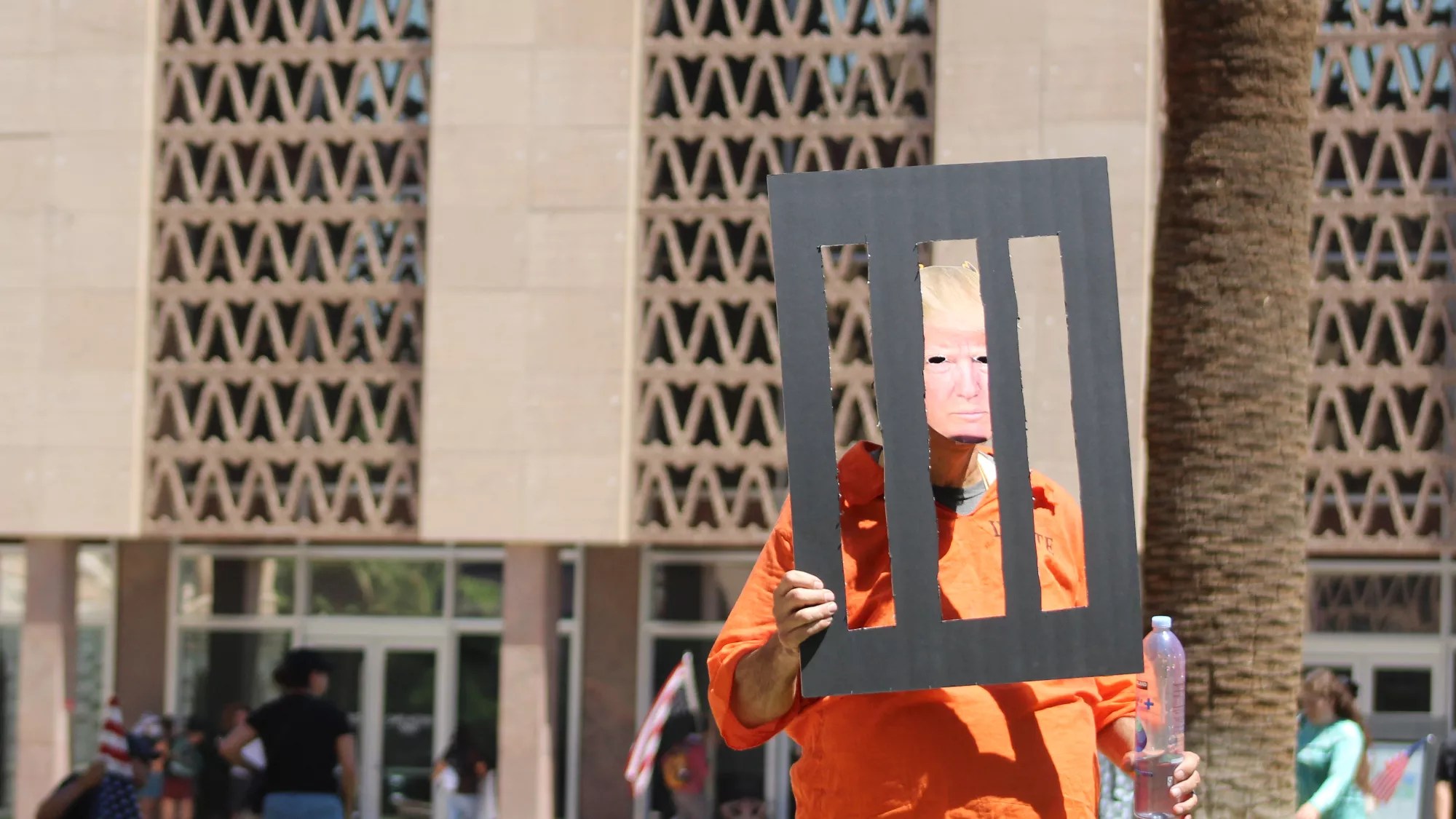 But Donald Trump was also spotted in Phoenix among the many thousands who converged on the Arizona Capitol at one of the nation’s 2,000 “No Kings” protests. He was traipsing around, hunched over in an orange prison jumpsuit and intermittently half-singing and grumbling to himself, “Happy birthday to me! Happy birthday to me!” from behind prison bars.