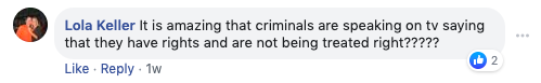 “It’s amazing that criminals are speaking on tv saying that they have rights and are not being treated right,” wrote Lola Keller.