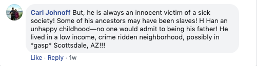 “But, he always an innocent victim of a sick society! Some of his ancestors may have been slaves! H Han an unhappy childhood – no one would admit to being his father! [sic]” said Carl Johnoff.