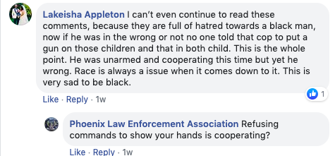 Some of the comments responding to PLEA’s post are racist. Others point out that what happened last year in Tempe doesn’t justify Phoenix police officers telling Ames they would shoot him in the head in May.