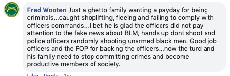 “Just a ghetto family waiting for a payday for being criminals,” wrote someone by the name of Fred Wooten. “Good job officers and the FOP for backing the officers … now this turd and his family need to stop committing crimes and become productive members of society.”