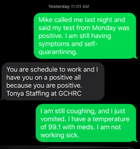 Reminded in a follow-up email that the worker’s text messages indicated that the facility did ask a staff member with symptoms to come into work, Rasmussen replied: “Thanks for pointing out the discrepancy, and what I should have said is that we would not require [italics in original] a staff member to work in those circumstances. As indicated, it is acceptable for COVID-19 positive staff to work with COVID-19 positive residents – in such circumstances, we may ask employees who have tested positive to work on the COVID-19 unit and assist in providing care to the residents.”