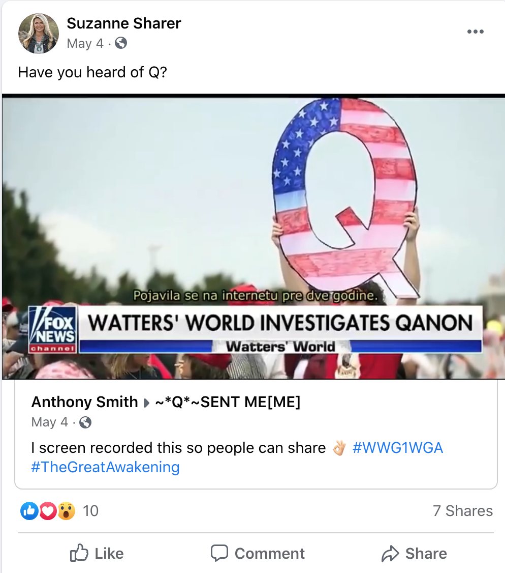 On May 4, she shared a video of a Fox News segment discussing QAnon on Facebook, with the statement, “Have you heard of Q?”