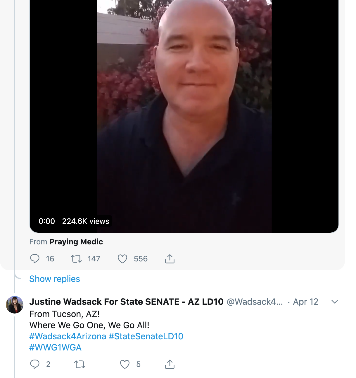 On April 12, Wadsack wrote in response to a video posted by Praying Medic on Twitter, “From Tucson, AZ! Where We Go One, We Go All! #Wadsack4Arizona #StateSenateLD10 #WWG1WGA.”