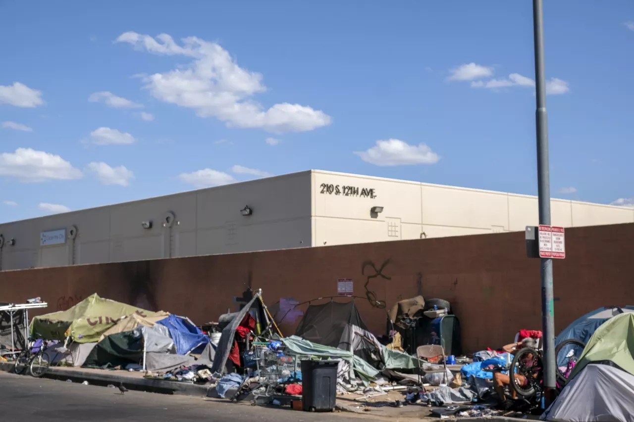 Tents line the street near CASS. Eighty-six percent of Phoenix’s 2023 heat deaths have occurred in areas without functional air-conditioning units.
