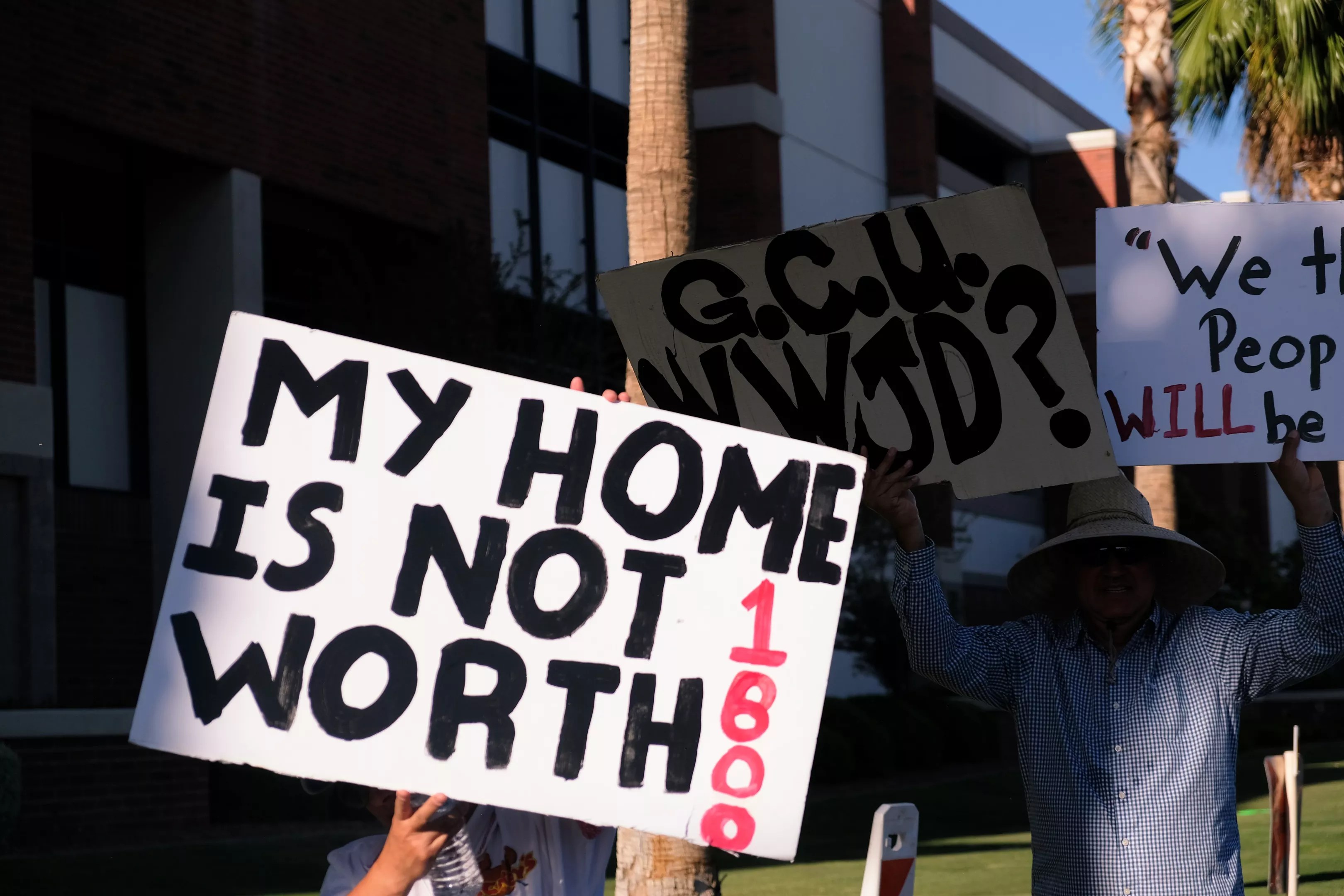 “Save our homes!” one sign read. “Grand Canyon University is leaving families homeless,” was another.