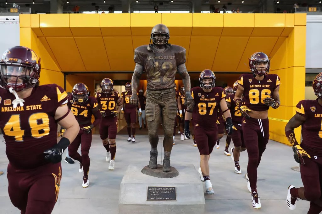 Arizona State University football players run past the Pat Tillman statue before a 2017 game.