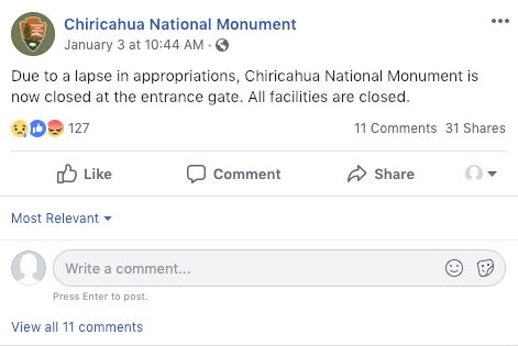 Chiricahua National Monument closed on January 3, nearly two weeks into the partial federal shutdown.