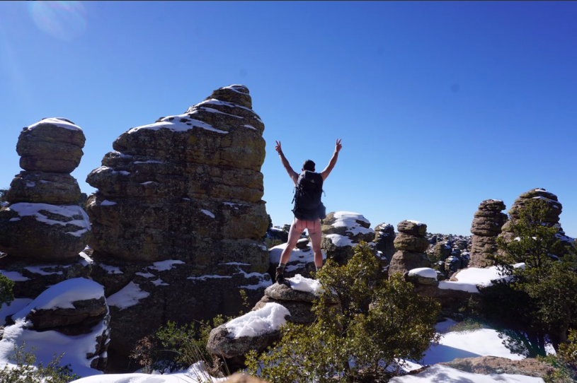 In one photo, Hankins’ arms are raised above his head in a triumphant V, his butt cheeks visible below a large backpack. The sky is a crisp blue, and Chiricahua’s famous rock pinnacles are dusted with snow.