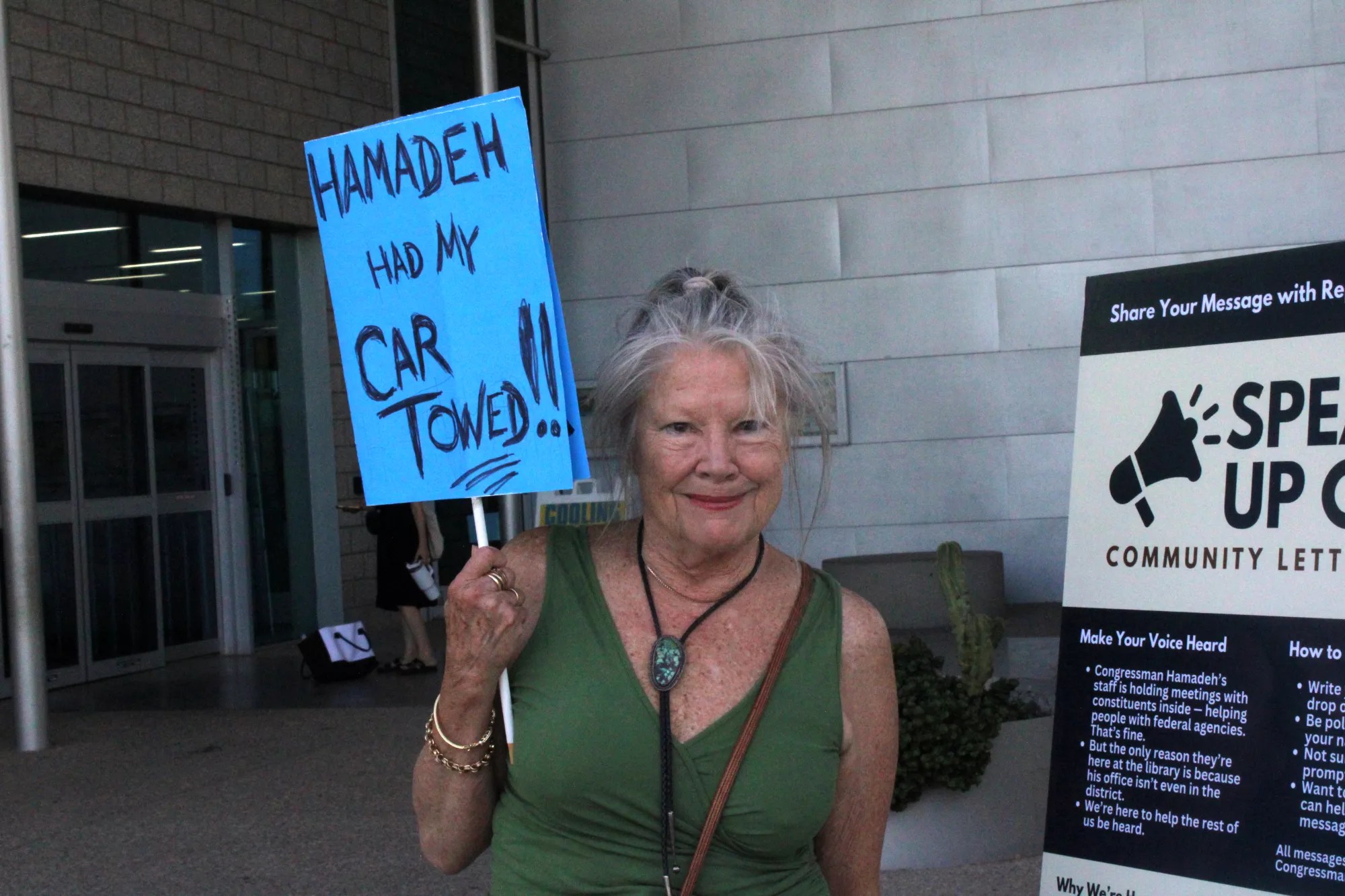 The next week, 76-year-old Sun City resident Pat Tonnema slipped up. She parked her Ford Escape in the building’s lot and walked over to join the protest with a few of her friends. But Tonnema said that “it wasn’t more than five minutes” before Peak announced over a bullhorn that someone’s car was being towed.