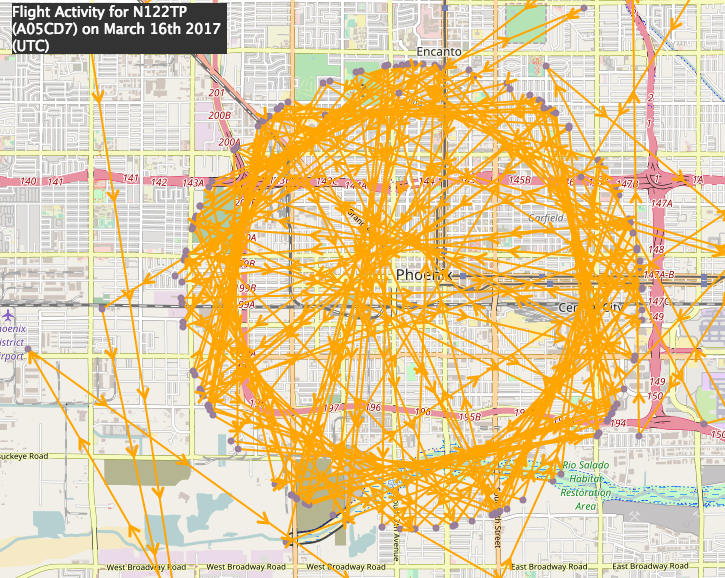 Historical flight data shows that on March 16, the surveillance plane circled around and around central Phoenix, as well as Tempe.