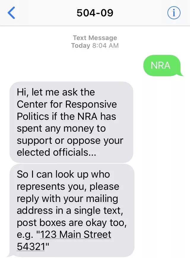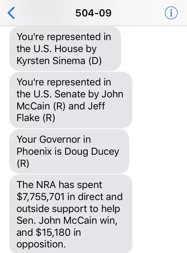 In a matter of seconds after texting NRA to 50409, you can find out who your state’s two U.S. senators are, your representative in the U.S. House and your state’s governor and how much money they have received from the NRA, plus how much the NRA has donated to their opposition.