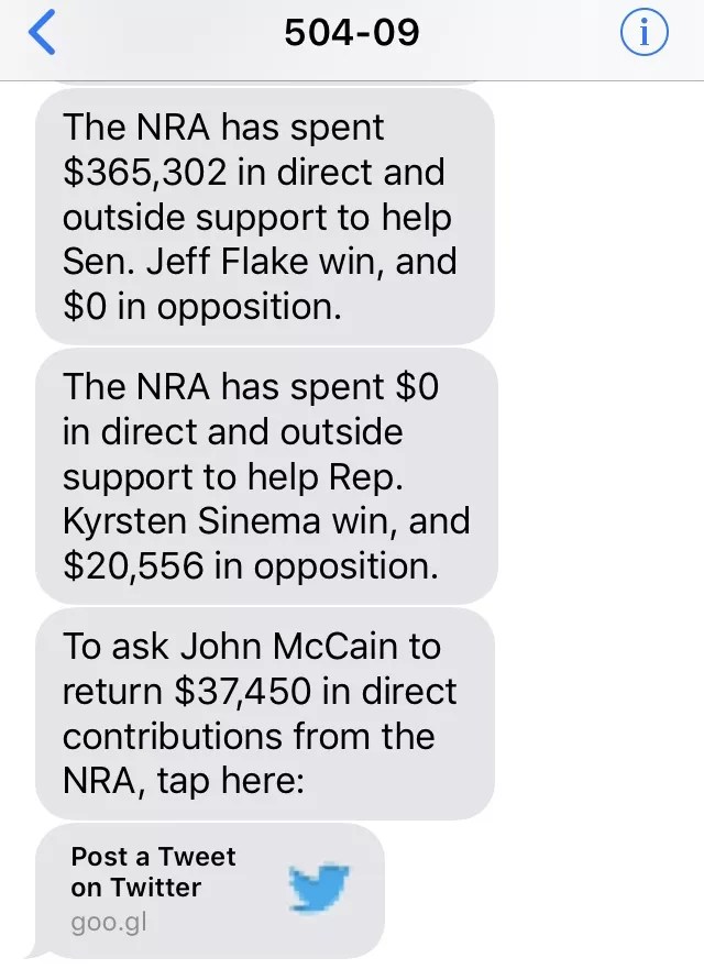It even took things a step further, and auto-created tweets about McCain and Flake calling on them to send back some of the money they received from the NRA.