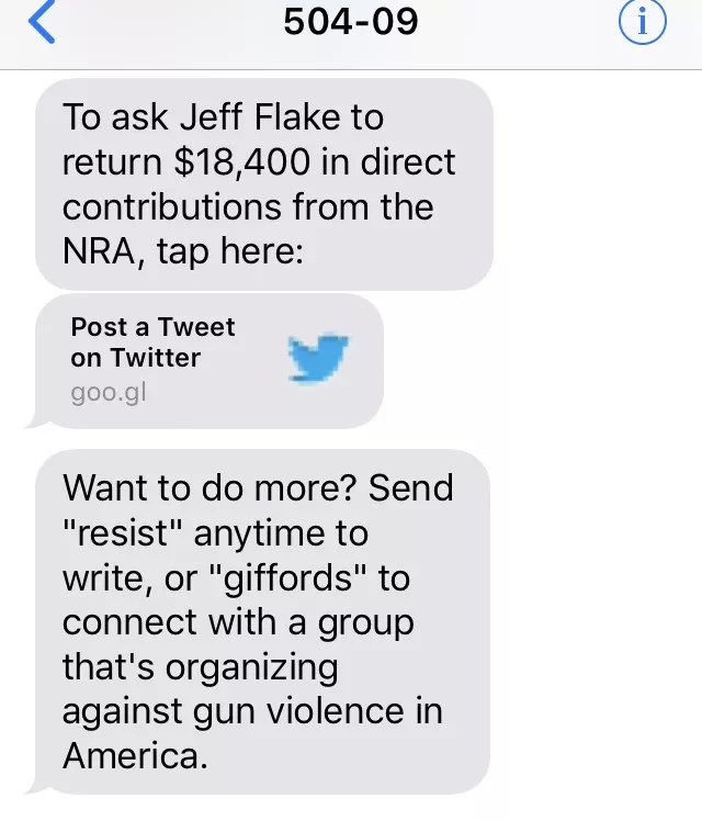 The final message it automatically sent us said what you can do anytime in the future. If you text “resist” or “giffords” it will connect you with a group organizing against gun violence in America.