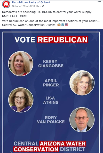 The CAP board, at least nominally, is nonpartisan, yet the Republican Party played a major role in Pinger’s campaign. She ran on a slate with two other Republican candidates, Rory Van Poucke and Kerry Giangobbe, and was supported by numerous local Republican clubs. Lewis ran their campaign, she said. Lewis was the sole dissenting vote among CAP board members in 2017 on a legislative bill to make the CAWCD partisan.