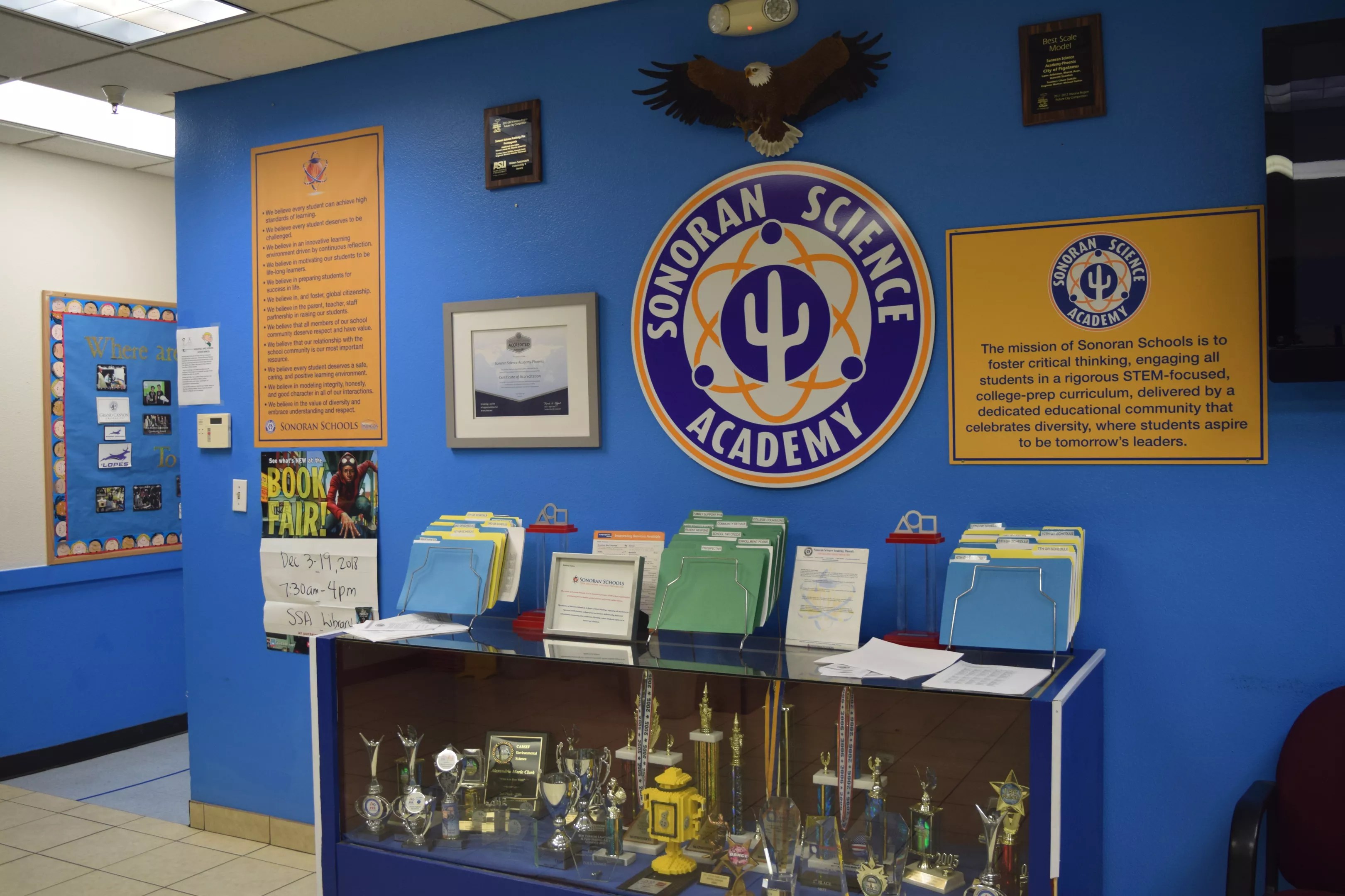 In glass cases at the entrance to Sonoran Science Academy – Tucson is a mountain of trophies, plaques, and citations in nearly every category imaginable: an award of meritorious achievement in the 2010 Arizona Academic Decathlon; a certificate of appreciation from the 2008 Tucson Rodeo Parade; a faded page from a 2003 edition of the Tucson Citizen that featured the school’s robotics program with the headline “Wired for Success.”