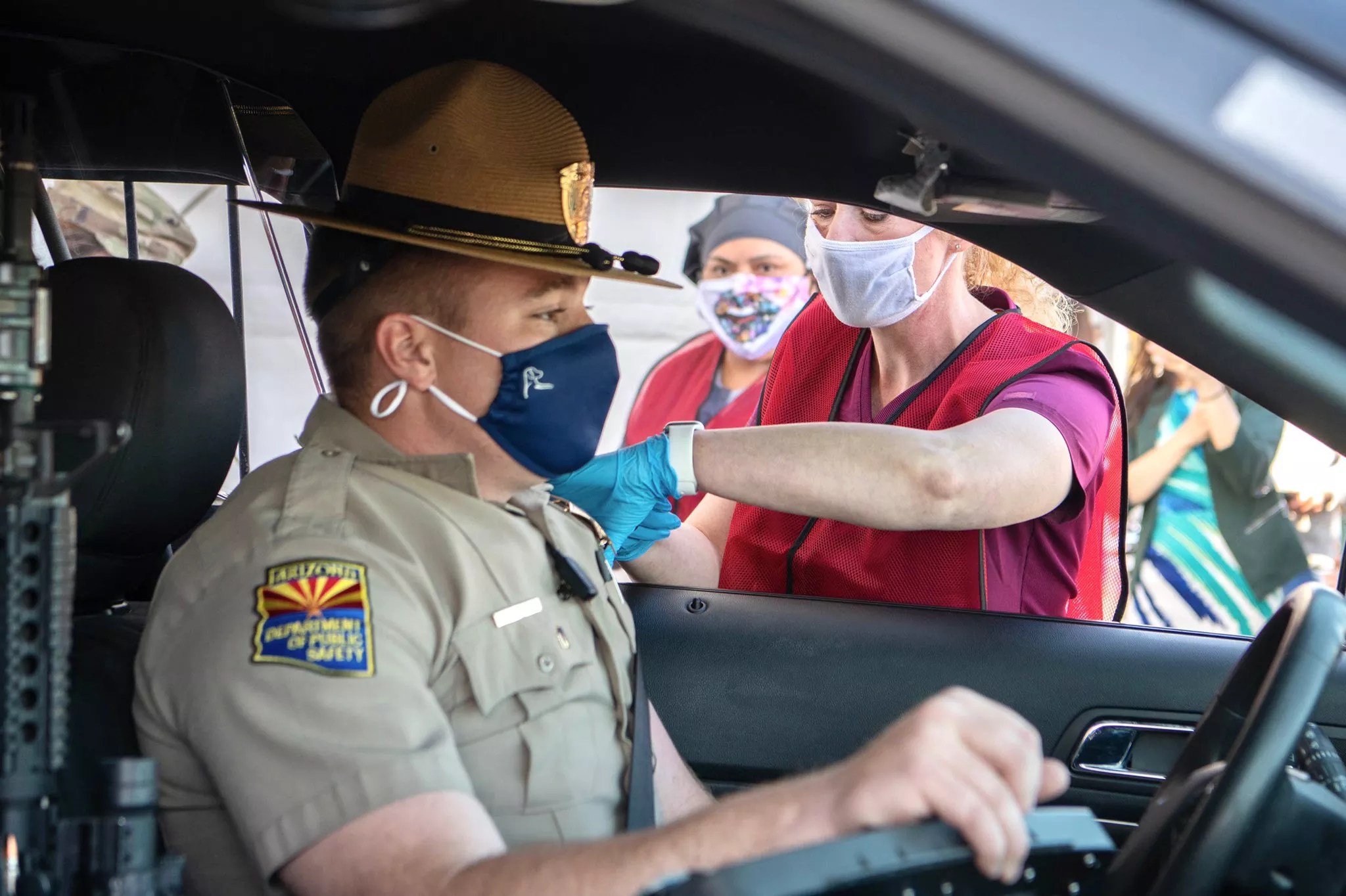 Arizona state troopers are among those receiving #COVID19 vaccines today at the @AZDHS 24/7 vaccination site at @StateFarmStdm in Glendale. Thank you Governor @dougducey, @drcarachrist, @aznationalguard & all involved in launching this site. Stay healthy & stay safe! #AZTroopers pic.twitter.com/Tua3VXx1OF