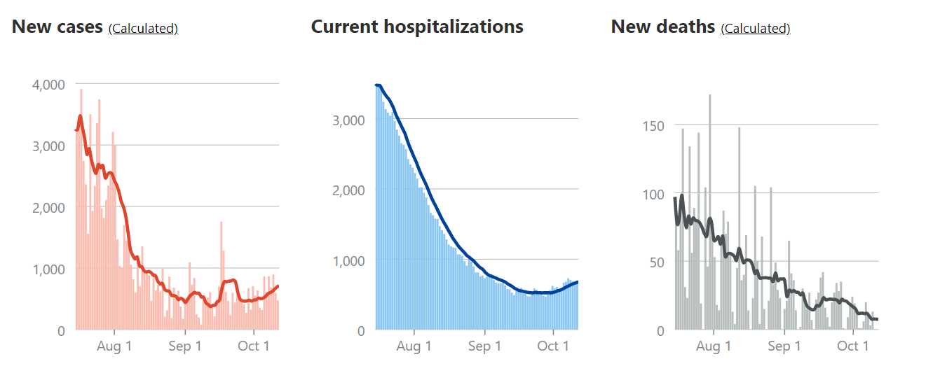 That increase is reflected in hospital bed usage. In a sign that the increase in positive tests is not just a result of more testing, the number of people hospitalized for COVID-19 has reached 667, around where it was at the beginning of September. Intensive Care Units statewide are still only about 70 percent full, with around 9 percent of total capacity being used by COVID-19 patients.