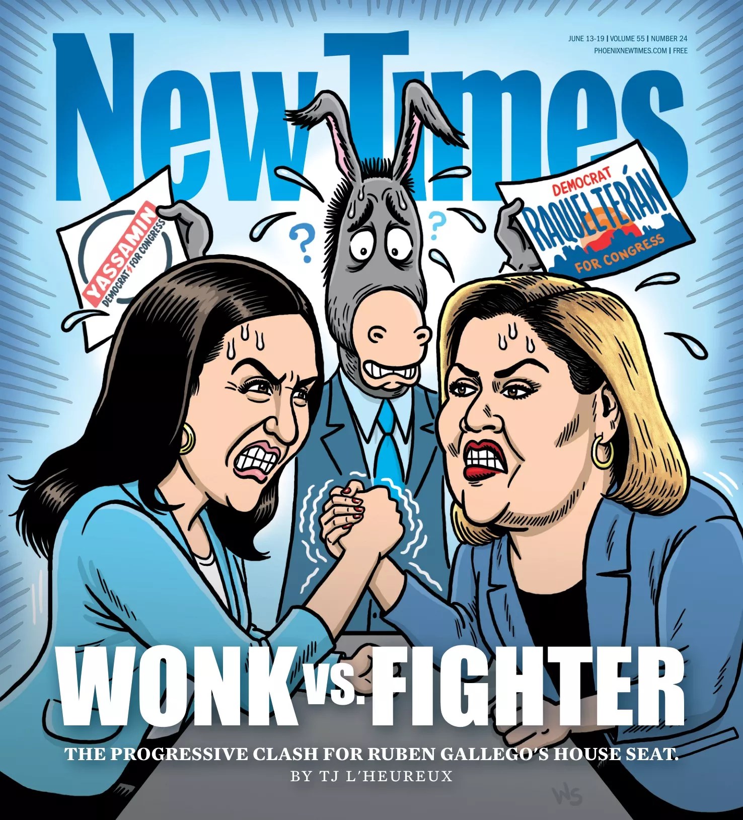 “Out of the roughly 38,000 votes cast in the Democratic primary to inherit Ruben Gallego’s seat in the House of Representatives, Yassamin Ansari bested Raquel Terán by a mere 39 votes. The cover art illustration by Ward Sutton captures the tension of the race and forecast the nail-biting finish.” – TJ L’Heureux, staff writer