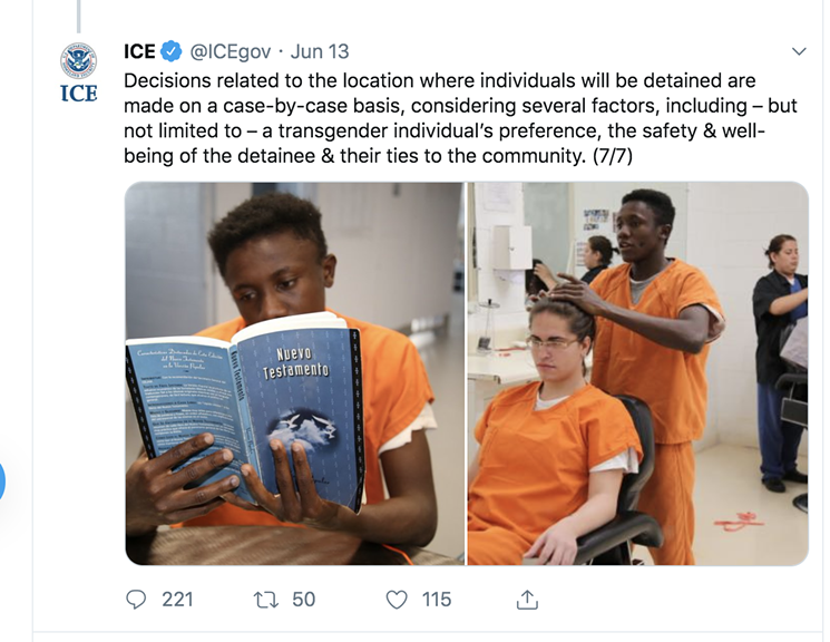 Tweet from ICE's seven-part Twitter thread highlighting the conditions within the Cibola transgender unit.